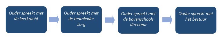 In de onderstaande stroomdiagrammen kunt u zien via welke route u met uw vragen terecht kunt bij verschillende personen. Als er vragen zijn over het algemeen beleid, dan kunt u rechtstreeks bij de teamleider of de bovenschools directeur terecht. De basisregel is dat u in het geval u iets bespreekbaar wilt maken m.b.t. het klassenbeleid of de leerlingzorg van uw kind u dit aangeeft bij de desbetreffende leerkracht. Daarna zijn de volgende escalatieladders van toepassing: